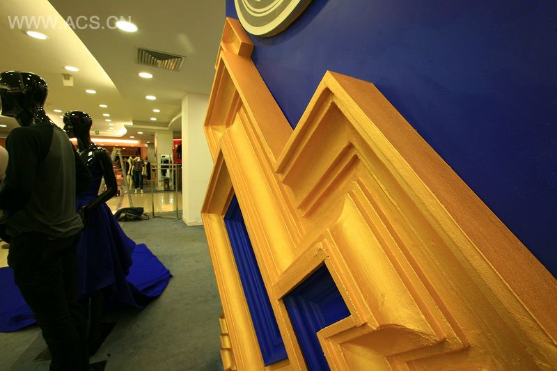 “皇家衣橱”品牌的街角店由ROW工作室设计,它融进了一个与它原始风格相异的环境中。此设计摈弃了许多传统装饰物的原始制作技巧,转而用大量工业化的手段替代原来的技术。以现代化的手段重塑传统装饰,整个设计就是以这个矛盾点作为中心的,它还通过历史元素的重叠与物质性来营造出抽象的组成元素。天花板采用了延伸式的塑料材质,它有时呈现出金色,有时呈现出蓝色,创造了一个无穷无尽的循环效果,它们之间相互缠扭,呈现在商店内的展示墙上,与斜纹的霓虹灯光图案共用了一个空间,由此框住了随意系列的纹章符号。蓝色灯光与深蓝色背景的相互重叠形成了一种工艺墙纸,将整个空间抹上了相同的颜色。