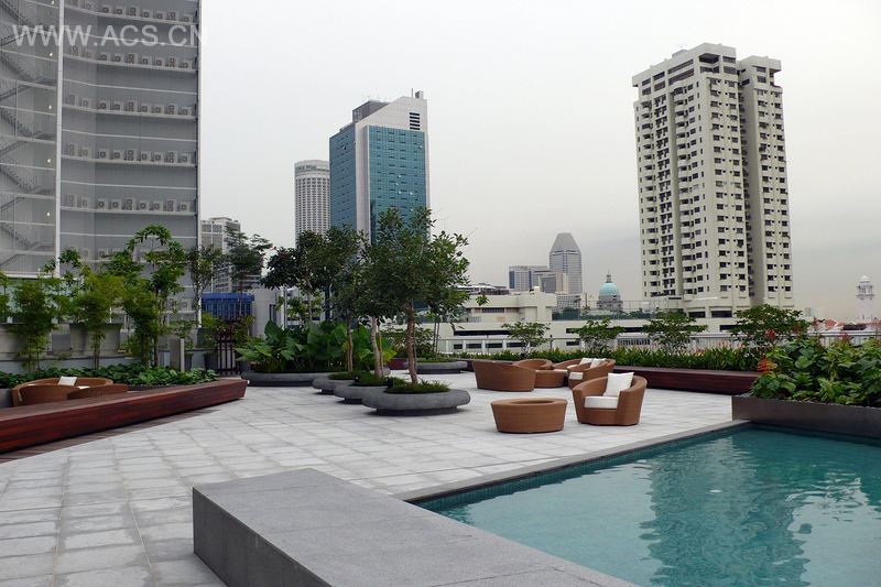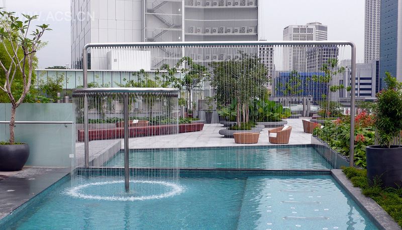 ONG&ONG Pte Ltd.受邀对克拉克码头进行景观设计。水景观在整个设计中至关重要。水池的上方是两个醒目的水帘,一个圆形,一个线形穿过了整个水池。这两个水帘就像雨水落下。另有一个有着清澈池水的小水塘环绕着建筑物而设。