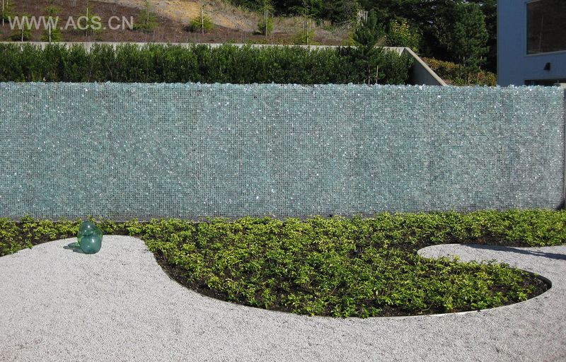 庭院中地被植物蜿蜒的边界和对比的白色碎花岗岩仿佛冻结了浪潮的流动,并带来清晨在海滩漫步时原始沙粒带来的宁静感。白色碎花岗岩紧邻的黑石砖为庭院提供了娱乐空间,同时捕捉日间的热量以供晚上散放。墙上有一个铜斗篷,连接了墙的缺口,水波荡漾沿着富有质感的铜斗篷流下,并流入伴有三座喷泉的水池,喷泉提高了院落中的潺潺流水声。当游客来到住宅或从庭院出来,铜斗篷和水涟漪吸引着游客向前靠近。
