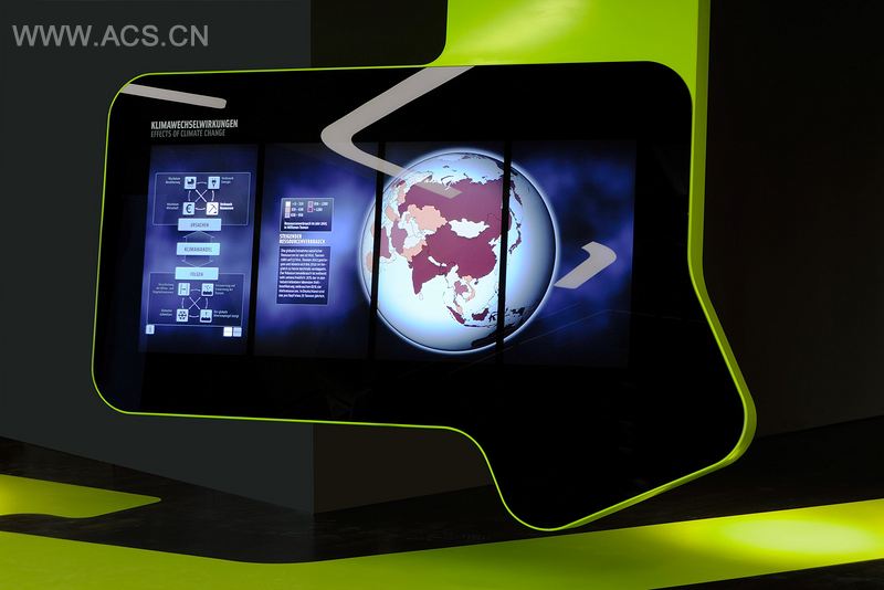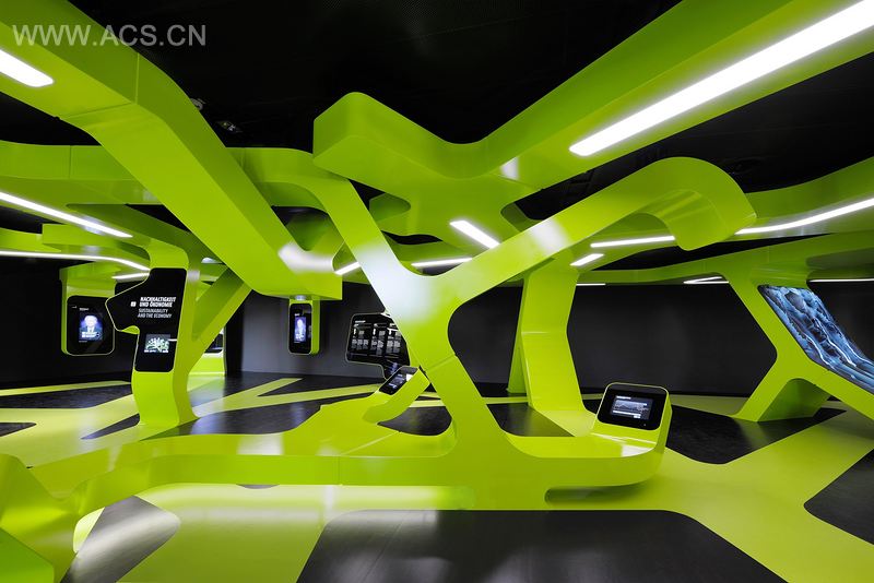 这个展览的概念基于两个主要形式:第一个是将材料和统计数据的物体化展览置于更为绝妙的水平;第二个是通过触碰机器的敏感表层来深入了解不同主题的资讯。这个设计从一开始就能唤起参观者的兴趣,前者以资讯化的雕塑或简单的物体形式放置在展厅空间的内部。后者以互动和信息传输工具的黑色外观形式无缝地融入进垂直元素当中,界定了空间中的不同区域。