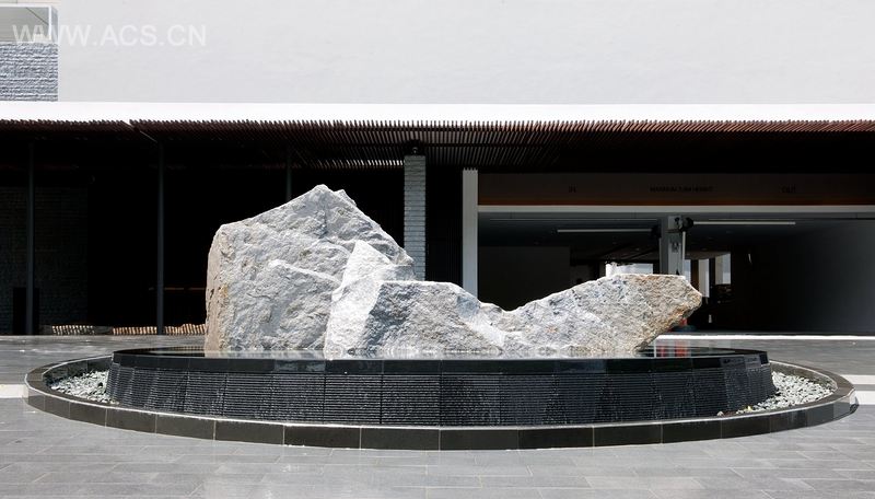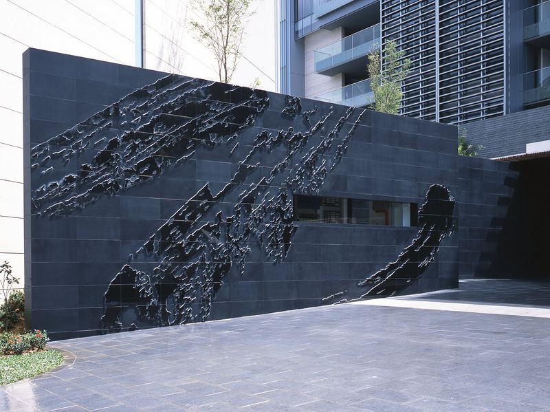 从街道上看,公寓大楼入口处的风景给人们一个强大的第一印象。车道围绕着安排在浅水池中的巨大岩石成了一个排列。正前方是一个大的雕塑石头壁龛(装饰性壁龛),通常在仪式的茶馆内可见。