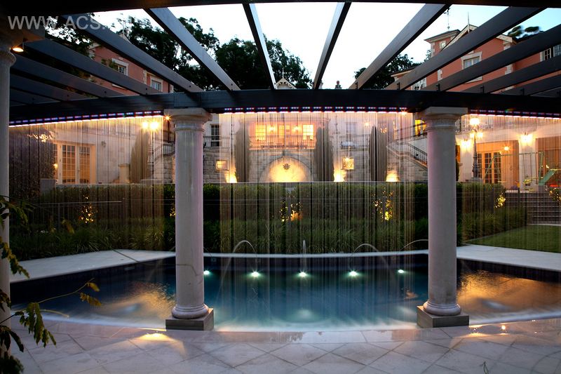 水池脱颖而出的原因有很多,包括独特的圆角形状的两个水池,紫藤乔木,还有那天衣无缝的衔接在一起的水池,景观和住处。量身设计和制造的弧形雨水帷幕有紫藤乔木的一侧那么长,由雨水帷幕内的光纤照明灯点亮,营造了一个美丽的充满戏剧意味的“声与光”效果。另外,一个大的容易进入的储藏室/过滤室加上75,000升的雨水储藏罐都已经被建在水池广场下。每年它都会潜在的节约数千公升的水,雨水储存罐既可以使雨水循环回收来用于灌溉花园的目的,还能补充水池水量。