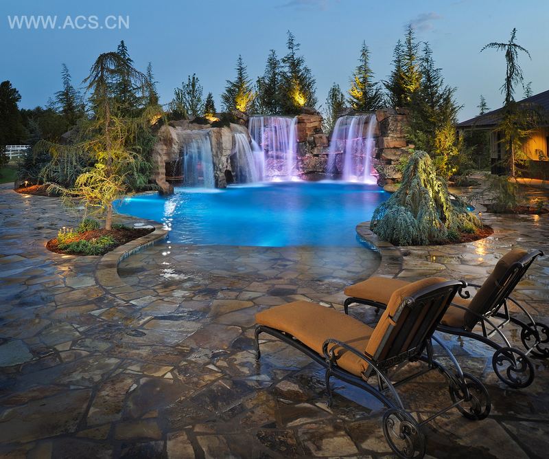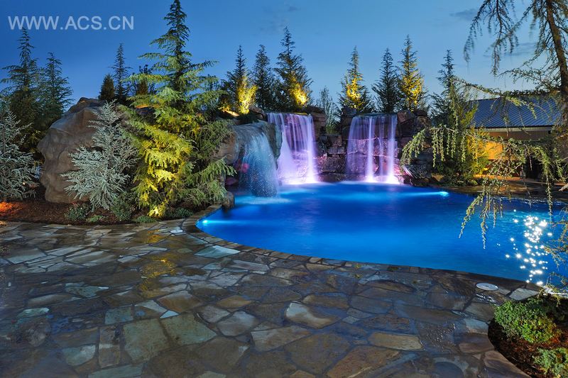 客户的家庭非常年轻和活跃,常参与各种体育活动,因此他们想要一个后院的水池,能供他们活动,并有相应的娱乐区域以举办家人和朋友的聚会。他们赞同我们的想法。鉴于客户家各面有1-1/2英亩向邻居开放,我们在认真考虑他们的生活方式后提出一个方案,既能满足客户接下来这些年的娱乐需求,并能保证私密性,与邻居分离开来。该项目宛如在某人后院中的度假胜地。方案包括了两个大约13英尺高的瀑布,瀑布之间还有一个大约8英尺高的跳水的岩石。毗邻瀑布有一个人造洞穴,通过两个游泳通过入口可进入该洞穴的泳池部分。从洞穴后面通过一个干燥的入口可到达一个干燥的露台,露台上有环绕声音箱和一个户外等离子电视。在山洞的顶端有若干小河床,水流从池子中经过开口处从河床边缘溢出。客户也同意我们沿着池边、瀑布、洞穴后面种植大量的园景树,使人们仿佛置身森林中。
