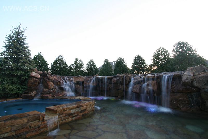 镶嵌有奥克拉荷马州本土的石板的一大片浅水区域让主人能够站在水幕墙下边。这个水池还包含一个游泳区,足够大,能够让人在里面放松。水疗区形状不对称,两个幕墙落下使水溢出水池。