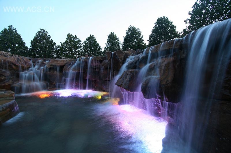 定制的色动力学照明灯秀被集中安排在瀑布,spa以及水池区域,在晚上可以有不同的动态展示,可以根据主人的心情而设置。