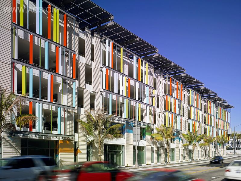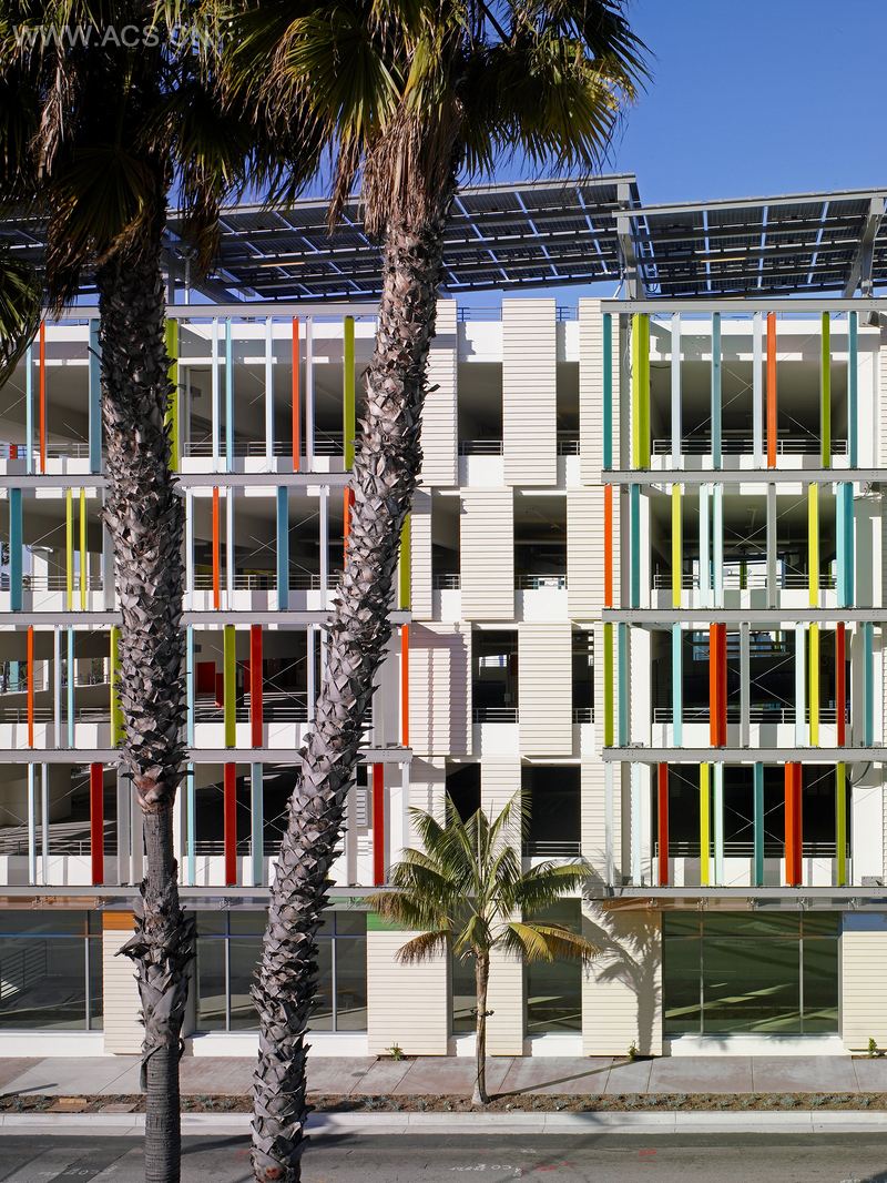 这个300 000平方英尺的停车场设计在一个建筑集群内确立了自己有力的存在,包括有历史意义的市政厅、法院和公共安全大楼。停车场提供了882个泊车位,包含地上六层和地下两层。建筑设有一个大门,作为整个市政中心标志容易辨认,同时提供太平洋的美丽景色,从楼上能看到整个城市。主广场露台上的咖啡馆推动了人流车流。所有外观的预铸式白色和肋混凝土面板采用了节奏感较强、斑驳的模式,捕捉和扩大明媚的阳光带来的大面积阴影,同时反射停车辆。一系列有缝彩色玻璃开间打破了结构的规模,并且大小和角度不同,为建筑带来光线、照明和不断变化的质量。晚上由于它们会被点亮,它们的光辉看起来就像一个闪闪发光的窗帘。这座停车场是美国首次通过LEED认证的停车库。屋顶、东西立面的太阳能电池板系统,用来满足整幢建筑的能源所需,而设计使用的元素,如树冠和光伏板,自己留下阴影,以减弱热岛效应、。停车场使用了具有高回收内容的材料,包括取代水泥的粉煤灰,可回收加固钢筋和框架。设计采用室外安装玻璃,提供了自然采光,并能看到租户空间和咖啡馆等所有常规建筑领域的景色。