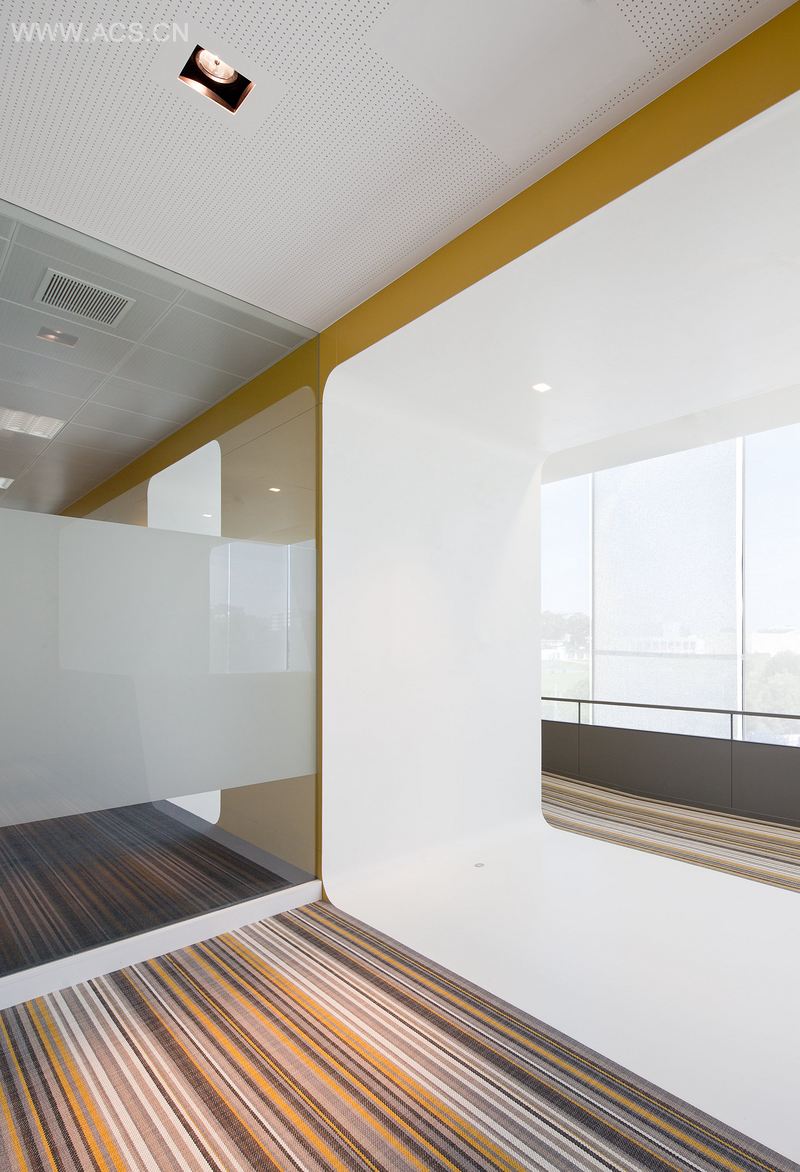 这个空间和视觉的动态效果形成于一块自由的平面中,这块平面通过颜色贯穿到整个空间中,增强了不同板块之间的感知力。波浪状的曲面根据其环境而设计,而办公室的天花板、墙壁、地板以及会议室都保证了视觉的连续性、动态性和流畅性。