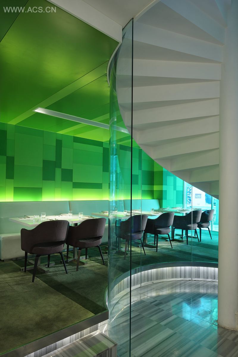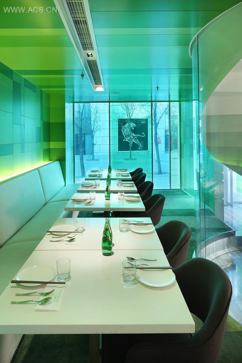 设计师的设计理念就是将这个600平方米的空间划分成5个功能区。除了厨房和吧台以外,所有的区域都是根据环境心理学的模式而设计的。每个进餐区都面向城市的风景,它们的独特颜色与窗户设计有助于让人们重新审视自己,并发现这座城市的点点滴滴。设计师利旭恒相信,在设计现代用餐空间时,首先要考虑用餐者的心理因素,因为它会优先决定用餐者的生理因素,当设计繁忙的都市中心里的用餐空间时,尤其要考虑到这点。吃饭绝对不仅仅是一种生理行为,它更是一种心理需求。