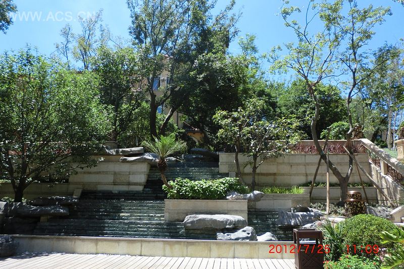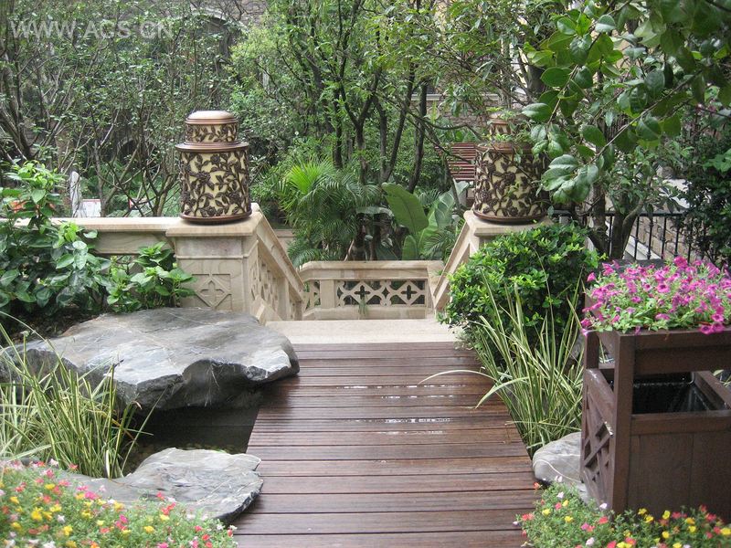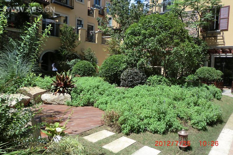 设计延续独特的合院布局特色,以植物设计为重点,在保障私密的前提下,旨在营造一个自然、水系环抱的阳光花园,创建温馨的邻里交流空间。从主入口进入,是一片开阔的草坪,周围用繁茂的植物围合,有效塑造独立空间的同时,又突出尊贵的感觉。蜿蜒的溪流,引导行人的视线进入幽静的小径,充分利用有限的空间将植物的遮蔽性发挥到最大。一开一避,创造了丰富的景观层级及视觉节奏,错落有致,充满变化和情趣。