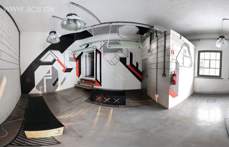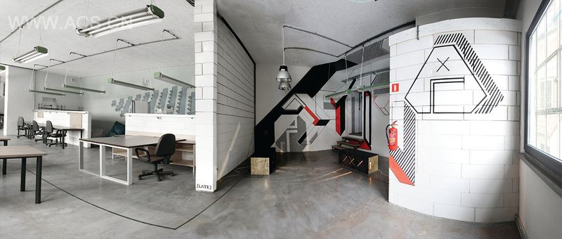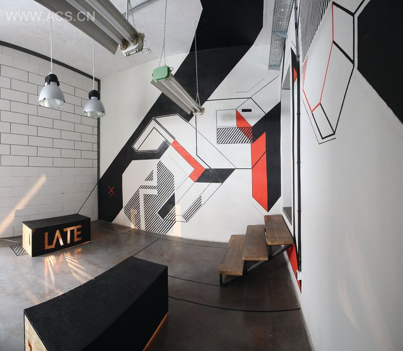 _AFxTT [...] 是一个具有多重关系的印刷产物,它逐步延伸并将整个空间联系起来。字母的直线与几何形状具有很好的透明度,它们完美地融入进室内的工业风格中。线条、平面和立方体的特点创造了颜色、形状与内涵之间的有趣联系。