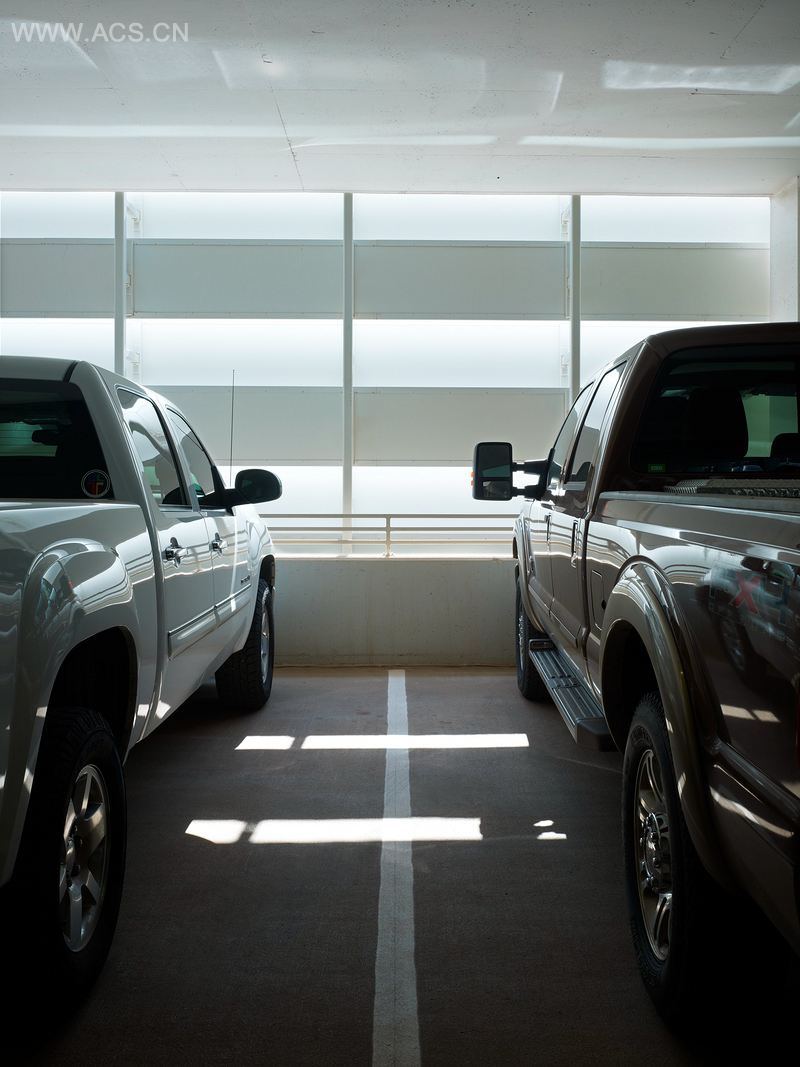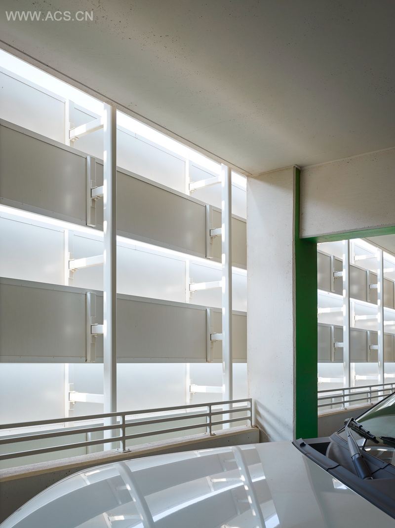 这座建筑物的外观以交错金属板为特征,金属板可作为屏幕,反射车辆,并作为一个开放的停车场提供通风。内部坡道和视野内的车辆由于相邻的结构达到和谐的视觉效果。金属板与毗邻办公大楼的细节匹配。车库西边的遮阳板从视觉上连接毗邻的办公大楼。水平面板大小不一,底层采用6“板条,较人性化,并在围绕外观盘旋和添加结构时分别改为1 ' 2 '和4 '宽度。建筑没有外部照明,内部照明在水平面板之间发光。该团队运用较强的方法提供被动安全措施。车库净高9 ' - 4”,允许更大的光分布,视线拉长,同时增强舒适度。内部没有剪力墙切断光或创建可能会鼓励犯罪活动的阴影。中庭定位的线性灯具形成垂直的线条光。停车场有很好的照明,给予雇员和访客安全感。每层都有一一个蓝色的电话安全k信报停。景观材料符合现有的企业场地,并且高于城市标准。中庭有一个关于季节性色彩和内部种植的旋转程序,能够反映户外季节性种植。Coloratus,一种常绿地被植物,缓冲建筑边缘,弱化了边缘和周边,提供季节的色彩和预防草坪维护设备带来的损害。建筑结构引入光和颜色,使得停车场成为目的地。为了突出色彩和提供照明,建筑师在每个交叉梁上安装首尾相连的T8线性荧光灯,向上照亮天花的面板。设计团队认可切萨皮克在能源行业的领先地位,注意到节能问题。照明控制系统在上午和下午高峰时间打开设备,而在非用电高峰期,系统关闭照明器的每四行节约能源。