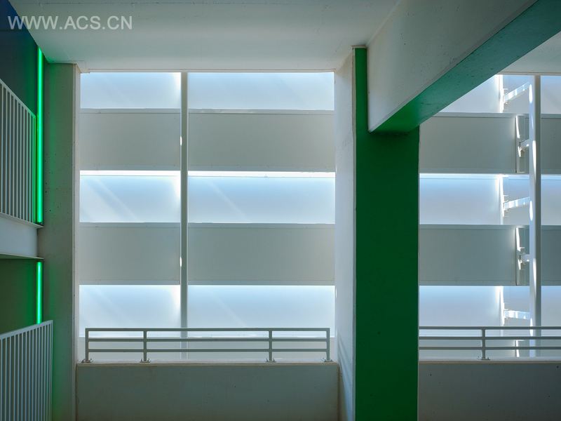 还有一个惊喜的元素是整个高度;13英尺宽、明亮的中庭促进空气流通。中庭包含一个层级色彩做成的光雕。自然光线可以进入中庭,使它更安全,并与自然联系。停车场每层都有主打颜色——红、黄、绿、蓝和白色——以便用户在停车设施内方便地驾驶。电梯置于目的地一侧,带有窗户,用户可以直观地将车库和目的地相接起来。楼梯既实用,同时优化了停车体验。楼梯间也添加了照明,以强调色彩和水平连接,并且提供一个大气的旅程。