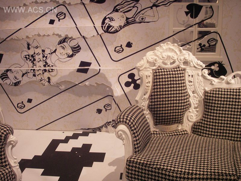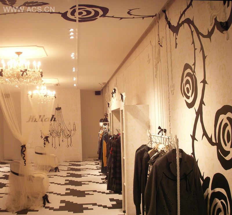 店铺的环境有点像是女仆的客厅。柔和的色彩以及不同的装饰品,例如花瓶、珍珠、蕾丝和“古老”的家具都形象地象征了它们是从墙面上裁剪下来的。这些“裁剪”下来的物件给悬挂的衣物(上面挂了珍珠项链)塑造了一个合适的背景,并突出了这些美丽的衣服。