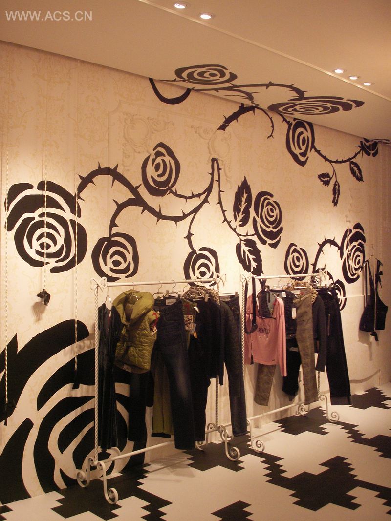 相比之下,黑色的骷髅涂鸦、庞大的黑色玫瑰体现了此品牌的边缘化和街头风格。