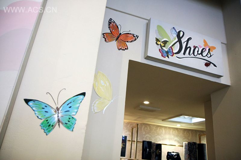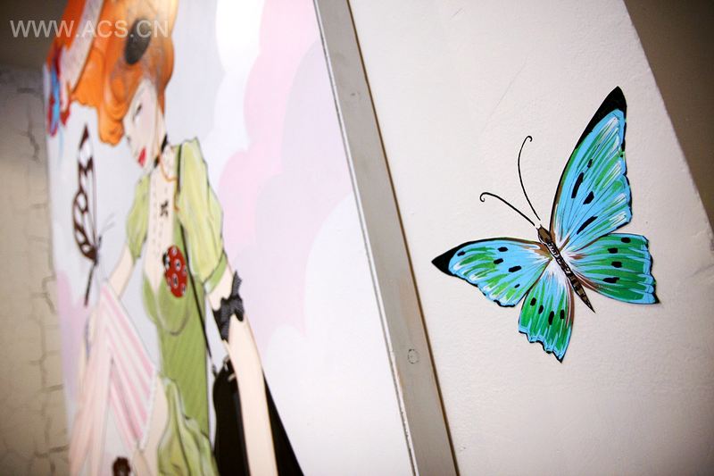 商铺空间里放满了各种装饰品,手提包和鞋子映衬在一面轻柔的瓦灰色背景中,它们唤起了多彩和兴奋的效果。我被委托设计那面空墙,顾客和行人可以透过主窗户看到这面墙。简单来说,就是用一些有趣的元素给最后那面墙壁制造出一点扭曲的效果,由此创造出一个“莱德小姐(Miss Led)”的形象,并用其装饰Mimco的产品。这样的设计方式不仅能突出时髦模特的主设计,还能强调“多即是多”的主题……并将其与理想形象混合匹配。我决定要营造出一种像糖果般甜蜜和浮动的感觉,它跟大型的童话式虫子及暗色甲壳虫形成了鲜明的对比。这个富有女性气质的设计要求有非常干净的绘画轮廓,并受格拉夫艺术所启发。与之并列的是完美的线条,稀薄的灰色和褐色倾注在作品上,增强了一种成熟感,同时还与时尚的概念一脉相承。