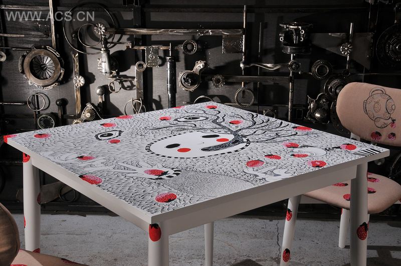 这间厂房位于布加勒特斯一处独特的位置,那儿包含了欧式大厅,后来改造成了文化中心。这是一个充满创意理念及潜在项目的非传统空间,它于2011年的“不眠之夜”活动中开放。我的这个作品符合中国黄道十二宫之说的“兔年”概念。有了这个主旨后,我在每个细节中都融入了特色的设计。所以说,这个2椅配套桌子极好地点缀了这个美丽而非传统的空间。