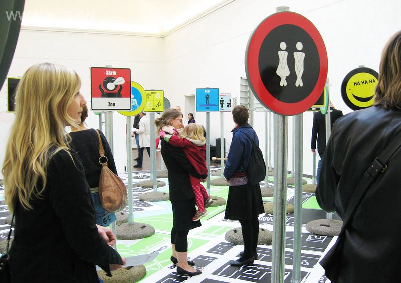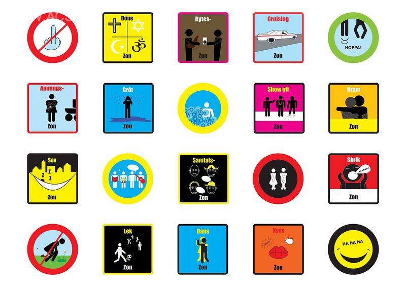 这个展览项目包含了50个标志,它们遍布在整个哥德堡的城市中心,提倡了一种使用城市空间的新方式。这些标志鼓励了各种各样的行为,例如弹奏音乐、野餐、跳舞、亲吻、打呼噜或喊叫。就这样,他们创造了一个自由地带,在这儿,人们能背离传统的规矩。每个区域都被白线所界定,而且附近都有一个标志。在这些区域里,人们被准许唱歌、跳舞等等。如果你在另一个区域的线上,会怎样呢?这些区域打破了社会的不成文规定,向公共空间里被许可和不许可的事情提出了疑问。私人与公共的界限在哪里?