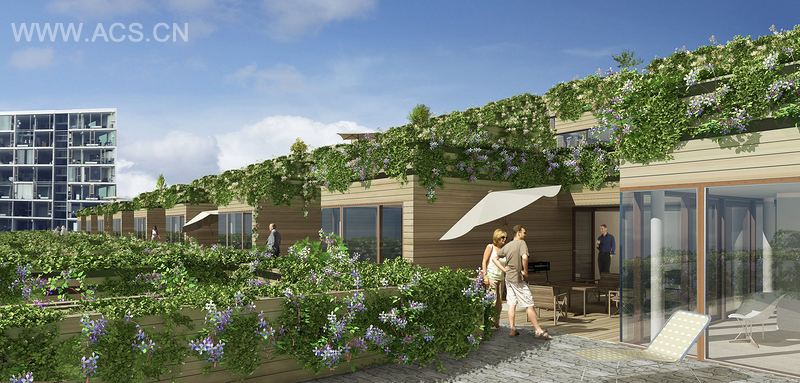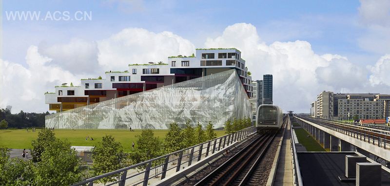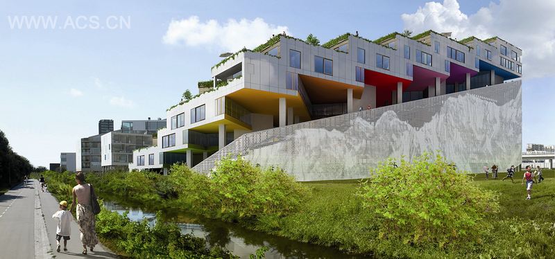 这个项目1/3面积是住宅,2/3的面积用于停车。我们设想,如果将联排住宅安置在停车场之上——如同混凝土的小山上隆起一层层薄薄的住宅,并从11层开始层层迭退,跌落到街道边,情况会如何呢?停车场需要临街,住宅则需要保障日照、通风和视野,因此通过结合这两个规划,设计中所有的住宅都有向阳的屋顶花园,视野宽广,同时,可在住宅同层的停车场空间内就近停车。该住宅山的外观如同流动在一个10层高的空间里的郊外花园住宅社区:与城市忙碌生活及郊区宁静生活都很临近。“山”住宅的 80家住户将成为奥斯塔德首批能在自己家门口停车的居民。大型的停车场内除了有480个车位,还有紧靠内墙设置的坡道电梯。一部分停车场空间净空达到16m,形成如同大教堂般的空间效果。停车场的北立面和西立面都使用了铝制孔板,保证停车场的日照和通风。立面上的所有孔洞一起组成一幅巨大的珠穆朗玛峰图案。白天,这些孔洞形成明亮铝板上的一个个黑洞,巨大的图案看起来如同经过粗栅格化处理的照片。而到了晚上,孔洞中透出室内的灯光,因为各层停车场的灯光颜色不同,从外面看起来如同色彩斑斓的照片底片。