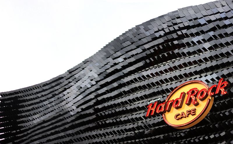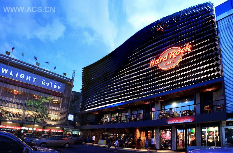 在建筑内部,全新的摆设和设备与整体空间形成了鲜明的对比,整个空间的墙面与天花板都被移开了,创造了一个更为开阔的空间。表演舞台 —— 是硬石咖啡厅的重要特征 —— 它包含了一个由阿努·帕若特工作室(Anon Pairot Studio)所设计的舞台,它的材料采用了循环利用的铝板,并将其重新设计成了牢固的结构。
