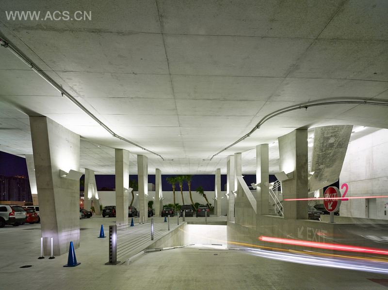 停车场是一个公共设施,就像火车站或者机场,人们可以在这里从一种交通方式换往另一种。林肯路商场是一个非常有生机的城市商场,一个步行购物街,掩映在郁郁葱葱的树木下,这里有些小规模的餐厅和酒吧全年夜以继日的营业,服务顾客。1111是一个供人们停车的新地方,这样人们就可以去逛一下林肯路购物街,看场电影或者去海边游一下泳。为了在零售区再建一个标准的停车场,一个用来掩盖难看的内部堆积的外立面与一个嵌入式的顶层阁楼是不能满足这个地方的城市需求的。看到这个项目的潜力,迈阿密海滩当局勇敢的批准这个地方更高的高度,但是不能太高。增加的高度只是用于挑高天花板,更多的空气流通,更远的风景以及是这个建筑物看起来更好看一些。这个停车场是一个全开放的混凝土结构。为了容纳其他长久的临时的规划,这个停车场的天花板高度不同与标准的停车场高度,是普通的两倍甚至三倍。高层是一个零售店和一个私人住宅,这个建筑物可以用来聚会,照相或者拍电影,时装秀,音乐会或者其他的社交活动,作为一个背景舞台能够提供惊人的效果。这个结构也是一个建筑物。这个停车场是由一系列混凝土板组成的有机体,混凝土板展开后分别作为楼板,柱子以及坡道。这些元素的位置及形状,来自于一些相互作用的力和地点与建筑原则要求的综合重叠,结合了规划选项以及与林肯购物商场结合,在奥尔顿路拐角处形成其起点的愿望。