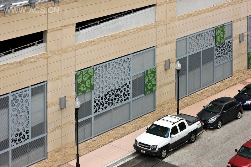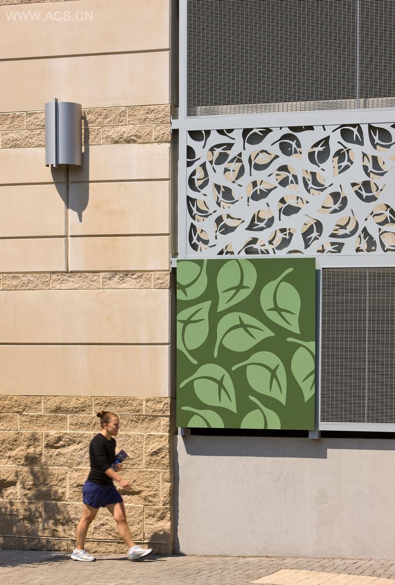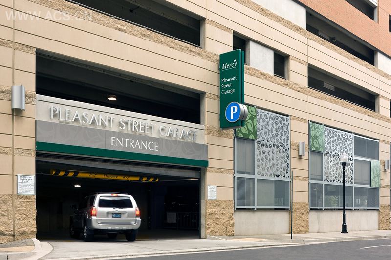 为了让弥补发展的校园里日益恶化的车库,Mercy Medical Center 想要设计一个新的停车场。这个11层,1350个停车位的车库成了一个有特征的存在以及从巴尔的摩东边进入医学校园的大门。建筑师和景观设计师一起在周边校园的建筑环境一起努力,把源于1990年设计的Mercy的品牌细节引进到新的停车场设施里。车库内的一般导视系统都是以当地旅游景点摄影为特色。从附近的高速公路上看,这就变成了一个可见的图标,有特色的薄金属片标志突显在固定在车库上并且面对病房的穿孔金属壁画上。这样的设计元素具有很多作用,像是屏蔽停车场坡道,充当一个通风屏障而避免使用昂贵的机械系统来保证梦寐以求的“露天车库”的称号,同时也展示了Mercy强大的品牌。车库的墙壁纹理是以薄金属片标志为特色,并且金属片是一片片的被喷沙建造固定在建筑物的外表面。通过校园的整个标示和导视系统,这个品牌得带了加强,提供了一个灵活的结构,营造一个舒适吸引人的患者环境。