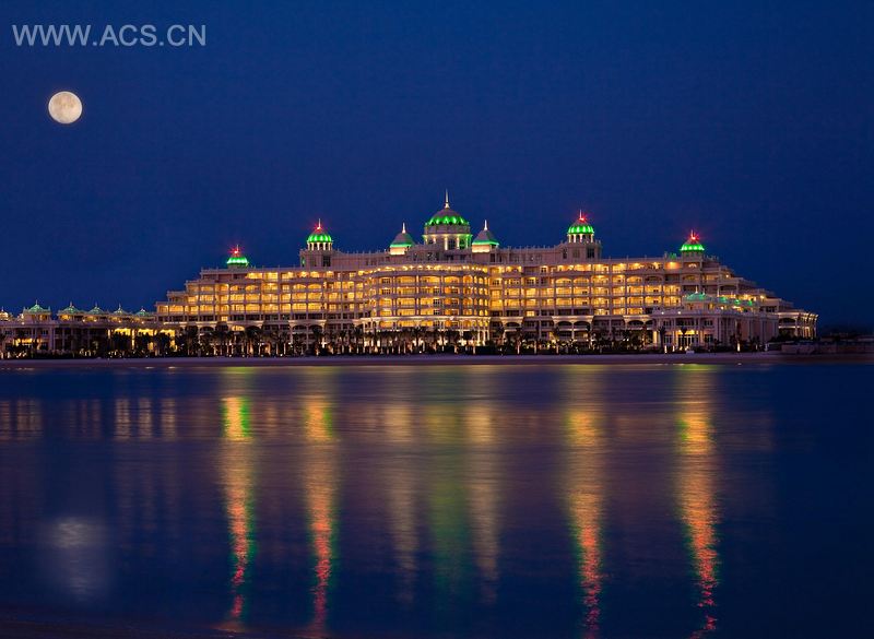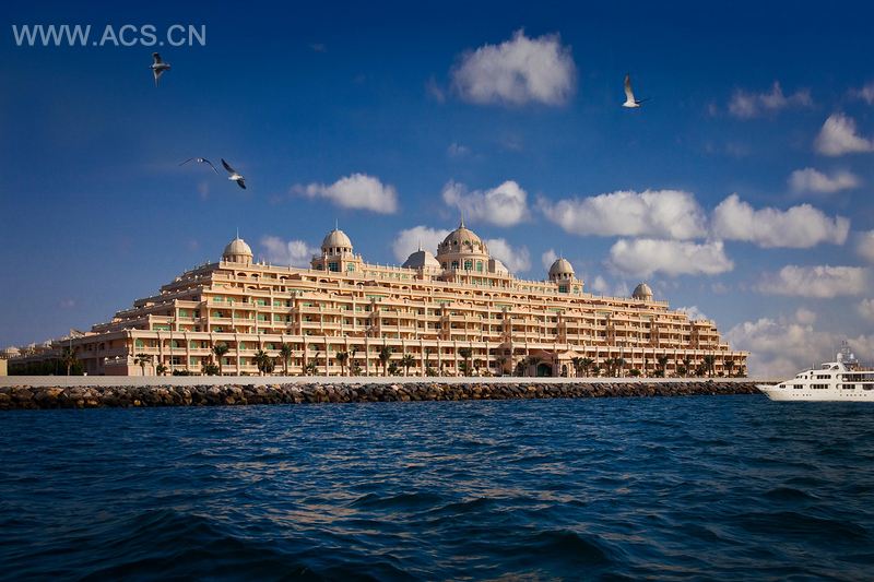 当车辆驶过棕榈树时可以看到位于朱美拉海滩前面的迪拜三大规划之一的绿色穹顶在地平线上脱颖而出,在树干末梢明确呈现出迪拜新地平线的另一个坐标城市亚特兰蒂斯的剪影。