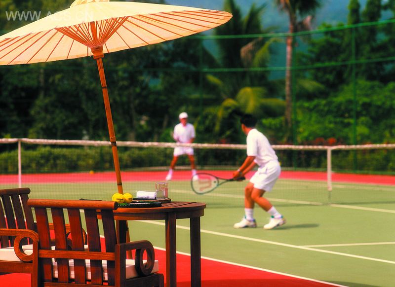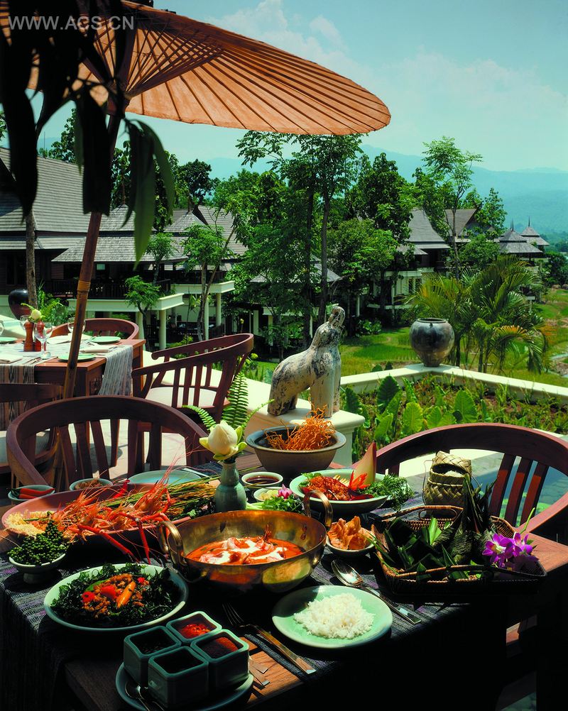 稻田环绕着度假村,似梦还真。亭子里搭建套房,呈现出奢华的王朝风格。在绿茵中,阶梯层层叠叠。在传统的建筑物中,石头和木材被广泛地采用。度假村和水疗就坐落在稻田的边缘。