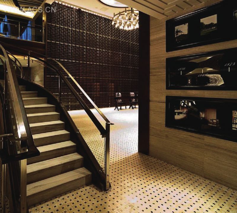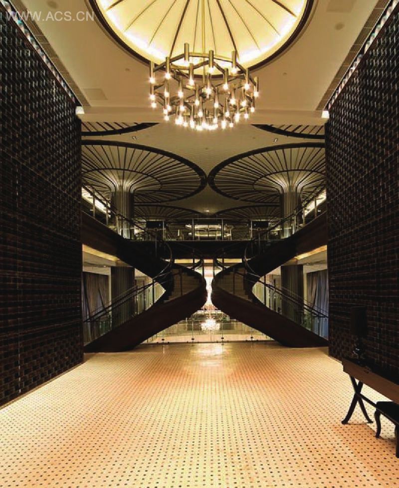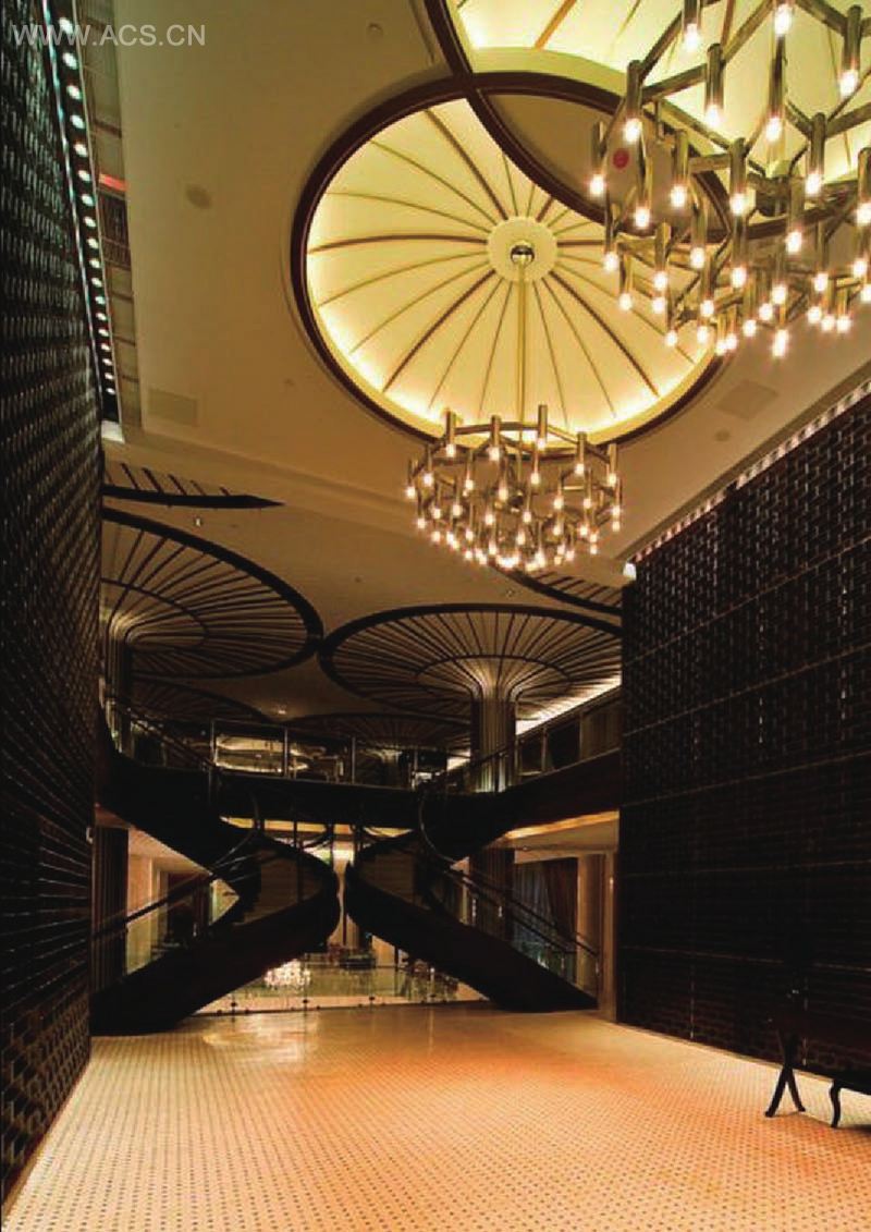 客人经过楼梯后侧边的水流开口可以直视地下室的部分造景,听觉也因而被串合起来。接待柜台和等候酒吧咖啡厅环绕四周。绕过弧形长廊经楼梯可来到地下室娱乐休闲区域。天花开口与一楼的水连同自然光和人造吊灯光线一起洒落下来,地下室廊柱阵列的设计给人留下较深印象。二楼餐饮区则含一楼入口看到的一二层链接的现代花柱,大圆顶的柱头直接构成天花造型,并和灯光一起把二楼整个区域的空间交代完整。柱子本身是由实木和不锈钢构成。另外,地下室的水池底部则是用大理石拼合构成的连续造型平面,也可作为整个空间视觉上的底层基座。材料、颜色和灯光本身并无特殊对立和冲突的意图,只希望和整体建筑自然融合。