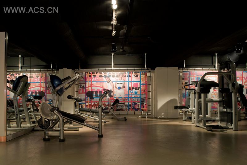 两面大旗从空缺处凸出来使得顶棚显而易见。而橙色通道则将你从运动区引向第一楼的大型有氧大厅。