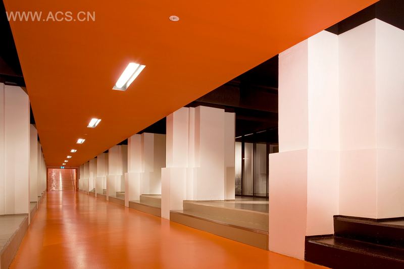 这个垂直的古典风格健身房楼层包含两个元素:木头的暖色调和教科书般的彩色线条。此外,这一垂直的特点还将会所分为服务和运动区,并同时建立起地下室和第一楼间的视觉联系。楼层的不同颜色也在空间上预示着两个区域的不同功能。服务区域例如更衣室,水疗房,物理疗房的地面为浅蓝色,象征着新鲜,健康和美丽。主楼道连接着吧台,运动区和有氧大厅,其地面颜色则为闪闪发光的耀眼橙色。沿着外立面共有四道空缺,空缺使得一楼的吧台和位于地下室的有氧运动厅之间产生特殊的视觉光线。因此,吧台也变成画廊一般。吧台的栏杆是一个长长的皮沙发。此外,空缺能给地下室带去光线。