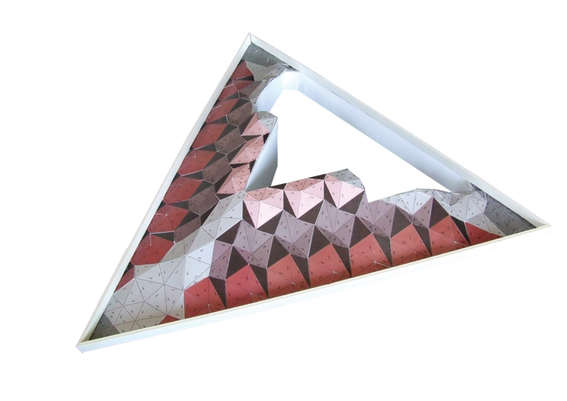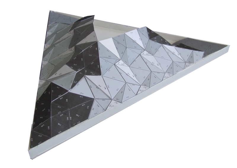 原本我们计划将建筑建成一个边长为7.3米的等边三角形。但是根据不同的项目简介我们也会做出相应的改变。新的空间建设的亮点就在于天花板。其设计是几何形状改变的结果。因此在这个三角形的钢铁建筑中悬挂着大约390块形状大小不同的背光板。