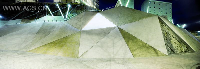 三角形面板由不同材料制成:现有岩石、不同颜色的植被以及用于加固和灯光的混凝土,运用照明在夜间塑造出其剪影。