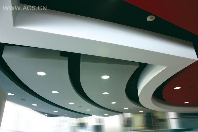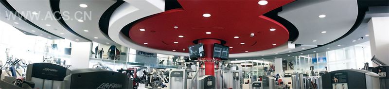天花板的设计赋予了体院馆创新性。我们以圆柱作为中心点,在天花板上以逐渐辐射开来的形式安装了不同高度的吊顶,中间的主吊顶颜色为红色,其余的吊顶则采用单一的颜色主题。毫无疑问,这样的颜色和线条能激发起人们练习的欲望。