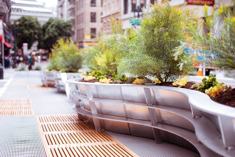 鲍威尔街步行区为旧金山两个最繁忙的街区而设,由奥迪资助,步行道是在原有的城市人行道上扩建而来,使用了铝和木制格子板,可以做花盆、长椅等等。虽然电车和私人车辆可以经过,但街上没有停车区。步道为路人提供了休息处所,可以闲坐、喝咖啡、见朋友,或者就是站着看人。设计非常有趣,并且采用了可持续性发展理念,siz PV塔能在夜间为人行道的灯提供能量来源。