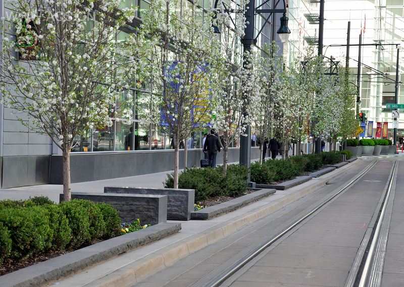 studioINSITE首先对科罗拉多会议中心和联邦特区之间的街景重建进行了概念设计研究,重新设计的加州街面与凯悦酒店有着一致的视觉效果。街景重新设计既包括花岗岩花盆和里面的观赏类植物、照明设计、花岗岩长椅和人行道表面修缮。项目还包括了1家露天咖啡馆和1面装饰性屏幕的设计,附近由Gary Sweeney创作的艺术作品也被重新摆放,为街景增色不少。项目为加州街建立了新的身份标识,在设计质量、功能和环保性方面都树立了一个新标杆。此外,种植面积也经过精心设计,以打造出合理的景观。总体来说,项目的灌溉、重点照明和植物材料选择有着令人兴奋的新方向,该方案已经成为了丹佛市中心街景设计的首选。
