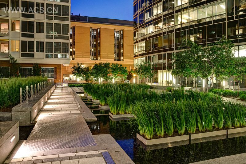 停车场上方的中央庭院以水为特色,表现了华盛顿的历史城市网格与宾夕法尼亚大道轴线的交汇。这个水景作为雨洪管理系统的一部分,收集场地内所有的雨水,然后雨水通过雨洪过滤器排入庭院下方五层停车场中的7500加仑储水箱,这些水不断循环,通过水生植物进行处理,提供补充过滤,存储的水还能在整个生长季节中用于灌溉庭院植物。开发区屋顶是广阔的8000平方英尺绿化屋顶,形成小气候,减少了当地的热岛效应,提供了鸟类的栖息地,使建筑隔热,减少屋顶径流。多余的雨水透过绿化屋顶层,被收集入下方的水景和储水箱中。这一可持续的实地水系统大大减少了开发区对城市污水管道系统的依赖, 因为城市污水管道系统不够完善,国家广场和低洼地区时常被淹没,造成区域河流和小溪的污染。