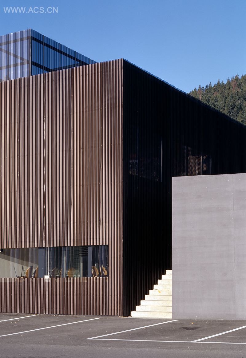 这个商业扩建区位于村庄和工业地带的边界处,它的造型低调,在这个位置隐秘地形成了一个零售中心。这座建筑只向人们揭示了入口区,而其余的建筑部分都由实心墙、窗户和技术装置组成,并被模糊地遮盖了起来。建筑立面上还配备了一层暗棕色的铝质板条,建筑通过其颜色、独特而全面的建造形式、正规的造型概念来反映出自身的设计特点,同时也象征了建筑内部的活动。