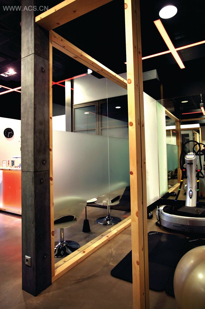 空间使用混凝土,木头,陶瓷和原有的工厂窗户给人以独特的视觉享受。设计的主题是两间根据运动功能不同而分开的房间。在这样一间70平米的小房间内,我们很难找到既能隔声又能隔光的办法。最终,我们采用大型木头框架并在中间嵌入喷砂玻璃来进行视觉隔离。而声音隔离的问题则由每间房内的调音系统来解决。