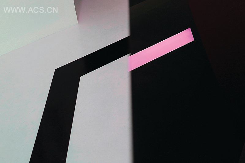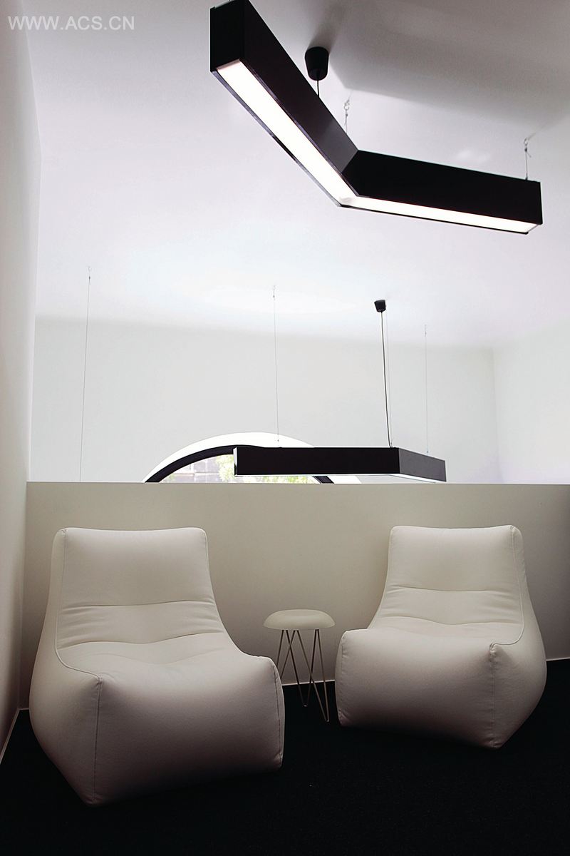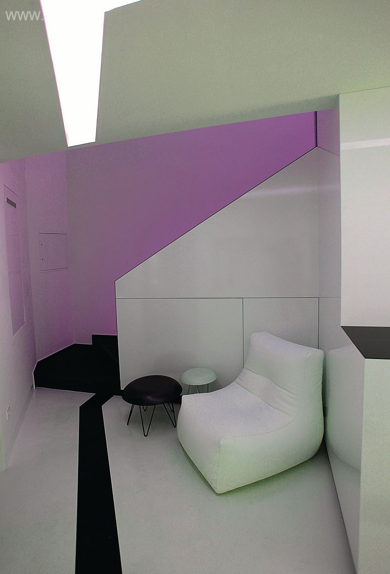 地板和楼梯上的几何条纹看起来像肌肉线条而紫色的光线却又给会所增添了一分女性化。一堵可移动的墙将健身区域和入口以及接待处分隔开来。室内的主要陈设是接待处和阶梯。我们的目标就是将它们身上体现的科技元素隐藏起来,将它们简化。