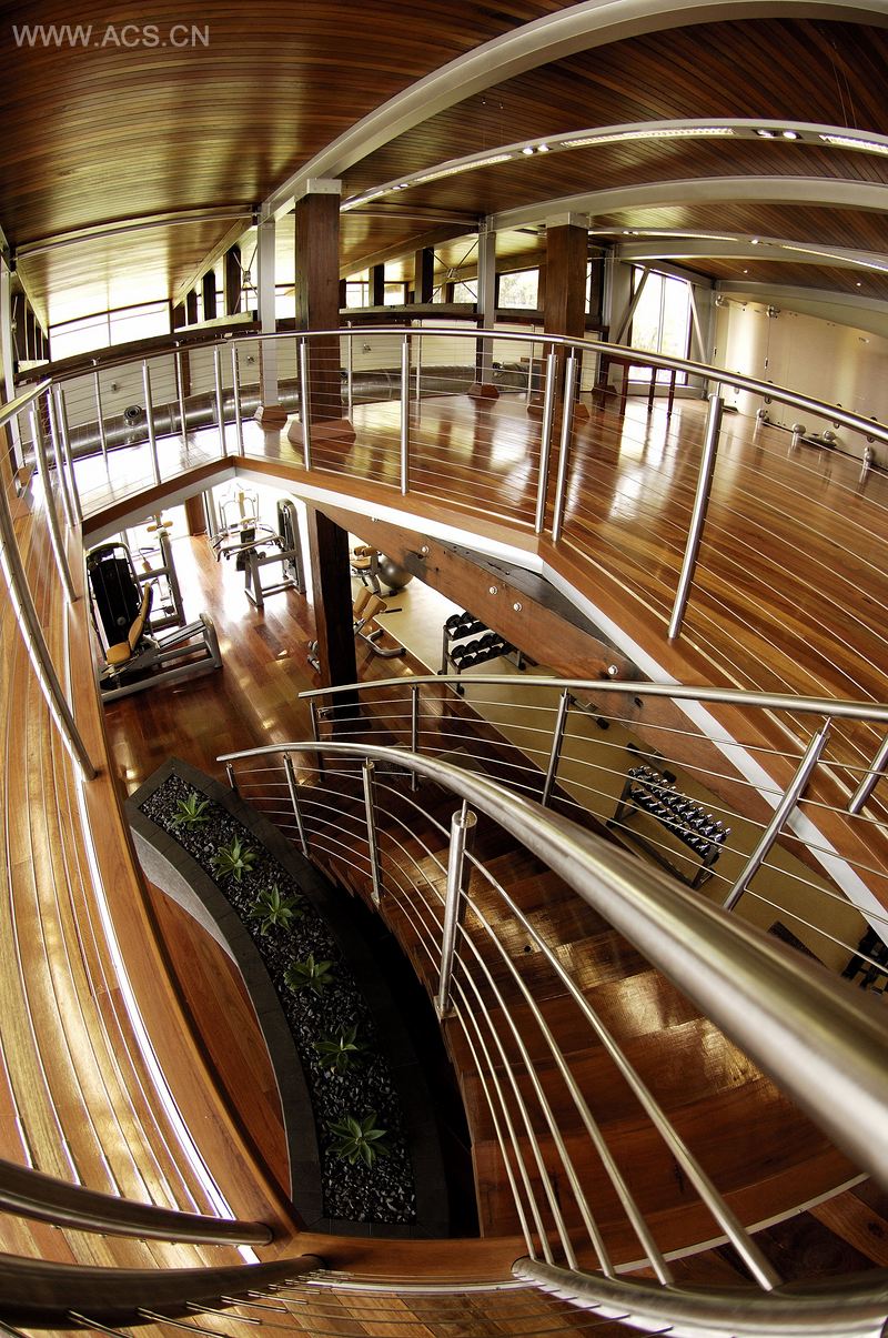 建筑物的内部则由有氧运动区域这样的精致地方组成。一楼则是重量训练和力量训练区。在楼上的个人训练区域则装备有整个澳大利亚最早引入的Kinesis训练系统。这栋环绕着直升机停机坪的综合楼被改建成了最优雅的集体运动房。楼外长20米的大型游泳池中的水是大屋顶平时收集的雨水。