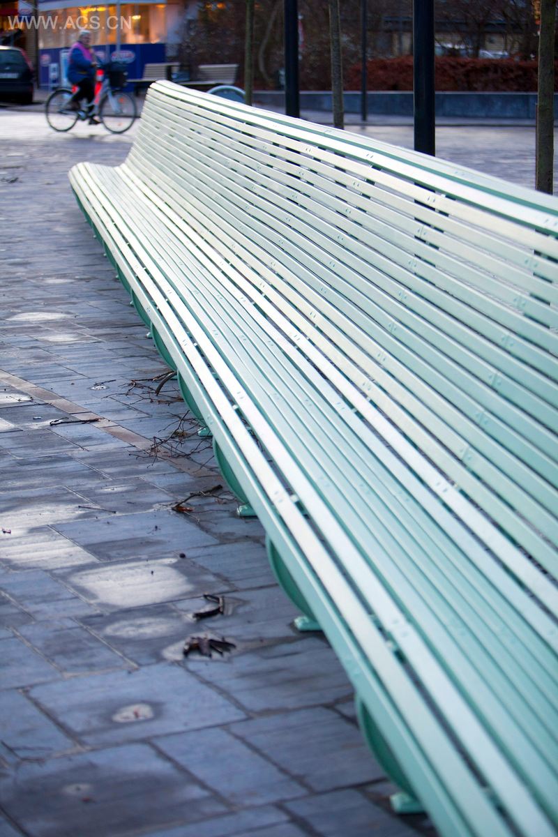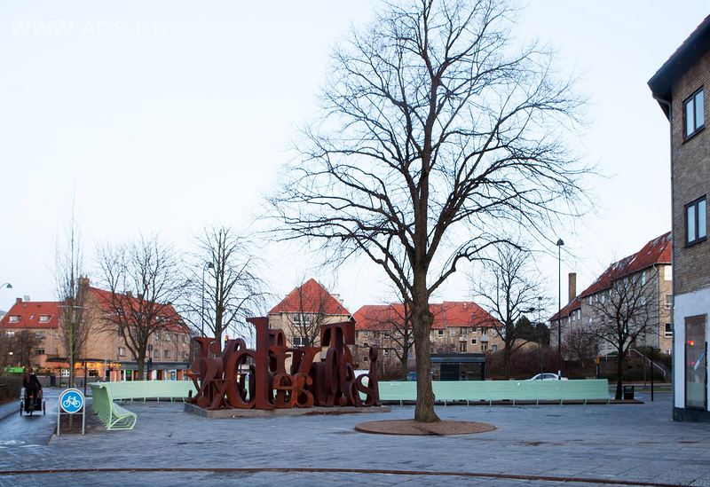 这个广场有两大居主导地位的元素:一座大型钢铁雕塑和一张曲线型的浅绿色长椅。雕塑融合了全部丹麦文字里的28个字母,向丹麦文化、文学等致敬。长椅则象征了民主精神。项目采用了特制的颇具质感的混凝土砖,看起来干净而精致。广场上的树木则为市民提供了树荫和庇护。图书馆外另有一棵参天大树,被板凳包围。路面由大小不等的混凝土砖铺成,表面看似木板的纹理。材料之间的对比营造出更经典和优雅的外观,颇具表现力。