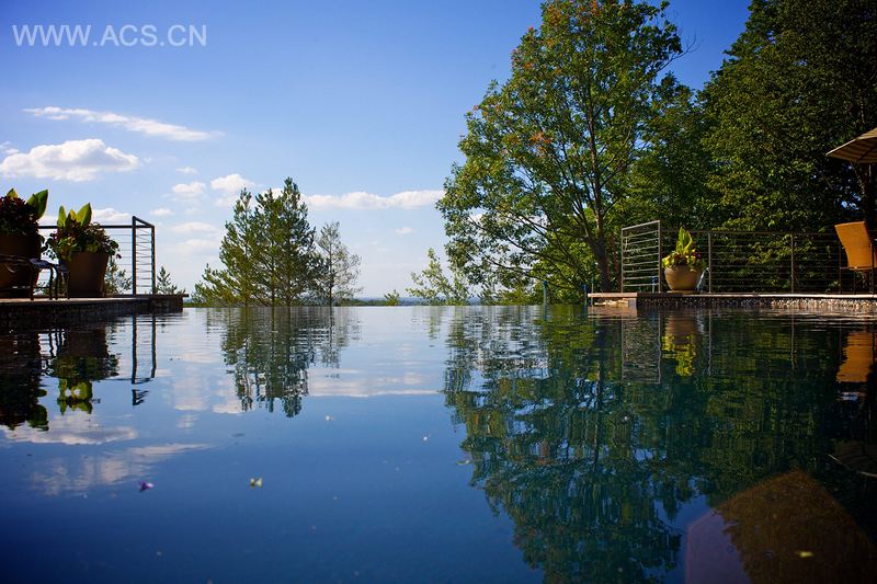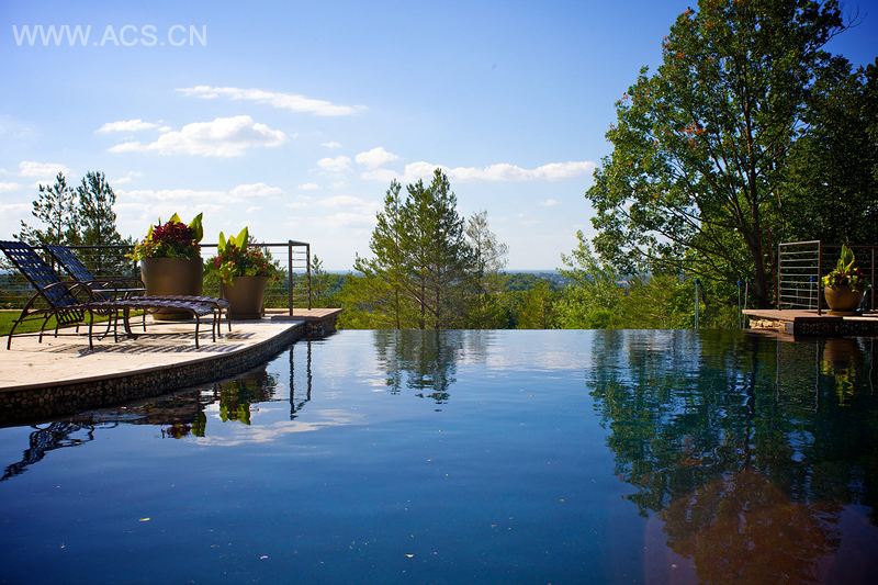 坐落在高高的山顶上,该处可俯瞰城市的壮丽景色和壮观的日落景色。该设计是需要大型挡土墙以创建两层阳台。顶层阳台由一个边缘消失在景观里的“自由形状”游泳池组成,消失的边缘降低9英尺,在天然石头上创建一面“水墙”,落入较低处草坪阳台的小水池里。