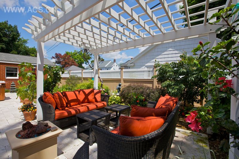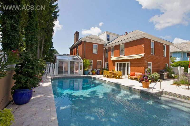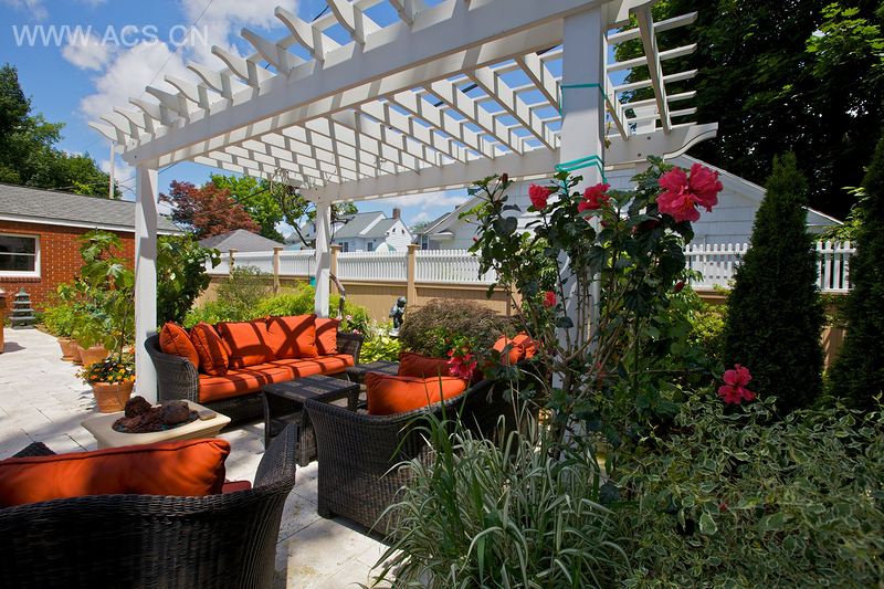 由于花园面积很小,且被邻近住宅俯瞰的特性,我们用篱笆创建了一些隐私空间,而且是开放、明亮的感觉空间。现有的铺砖被移除,换上了浅米黄洞石。浅色反映了客户的折衷的收藏品和丰富多彩的蓝色陶瓷花盆、游泳池和多姿多彩的植物。