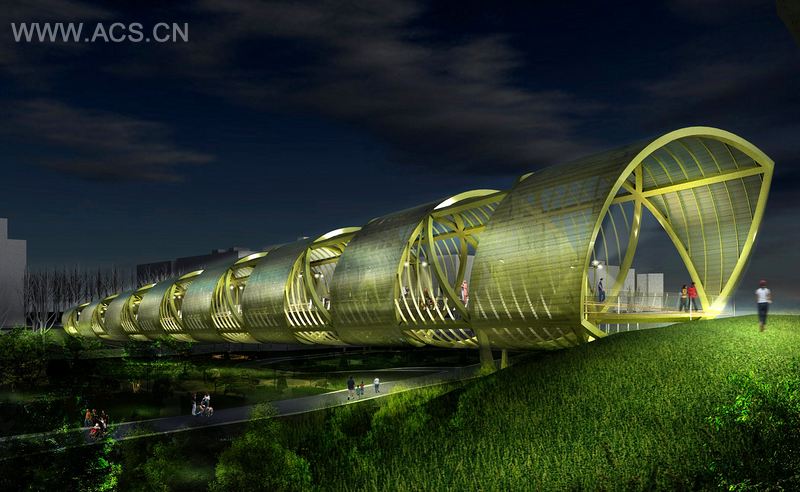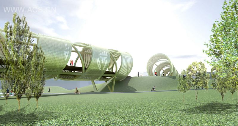 Arganzuela步行大桥位于西班牙马德里,横跨曼萨纳雷斯河到达城市公园,由Dominique Perrault建筑事务所设计,这也是该事务所的首个土木工程项目。这座桥由一对圆锥结构组成,外部包裹着互相交织的金属丝带。这座桥为曼萨纳雷斯河两岸提供了一个直接的通道,同时也为逛公园的行人和自行车提供了去往下游区域的道路。透气的设计让自然光可以穿透树叶直达公园内部,并沿着桥梁跨距建立了视线连接。两端的结构柱支撑了整座桥,使它看上去好像漂浮在水面上。金属网状的表皮结构能够有效地抵御极端天气对内部的侵袭。当行人在桥上漫步时,律动的空间和透明感将给人们带来独特的体验。步行区白天不乏荫凉,而晚上则在灯光烘托下熠熠生辉。