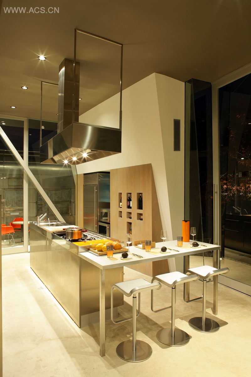 该房屋实现了一种真正的无论白天黑夜,不分室内室外的生活理念。一个朝天空开放的室外起居室,毗邻一个封闭式的起居室,被安置在前面悬空区域。该房屋各个房间的玻璃以及开放区使得各房间从视觉上和空间上融合在一起。舒适的南加利福尼亚气候使得进一步模糊室内外的界限成为可能。侧滑玻璃墙,树脂板以及可移动的室内隔断甚至能将私人区域都完全呈现在整个房子以及远处的自然环境中。通常被用于商业结构中的钢结构工艺被用在此项目中,以承受悬浮体轧制的地板以及实现无墙结构。