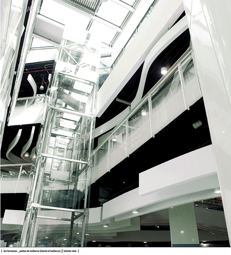 在主中庭里,垂直元素勾画出了整个建筑体。稍微倾斜的柱子上覆盖了一层白色的金属板片,由此营造出一种不均衡的感觉,而玻璃电梯则揭示出了它作为图腾柱的结构功能,并强调了购物中心的尾部。购物中心里,不锈钢的商铺间隔装置恢复了一种人性化的韵律和比例。这些垂直元素偶尔可以用来承载标识系统,它们由露娜所设计,并获得了一种极为优雅、明晰和极简化的效果。