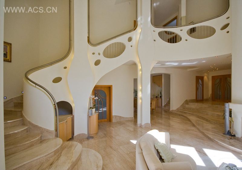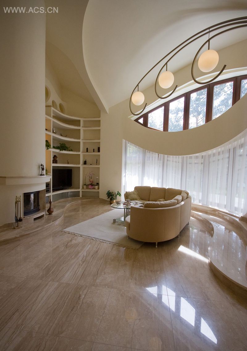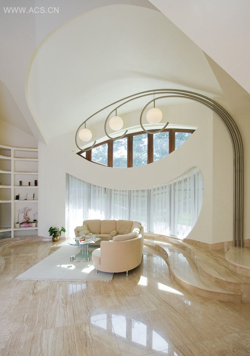 大大的起居室既明亮又宽敞。自然的颜色以及有光泽的材料例如镜子、大理石、花岗石的使用将来自宽大的窗户和室内其他地方人工照明的灯光反射,更增加起居室的明亮感。起居室最大的亮点是窗户,釉面凸窗一直延伸到二楼,两层楼高的凸窗将花园装饰得令人难忘,同时满足起居室和夹楼的采光。这一不常见的窗户是特别订制的。