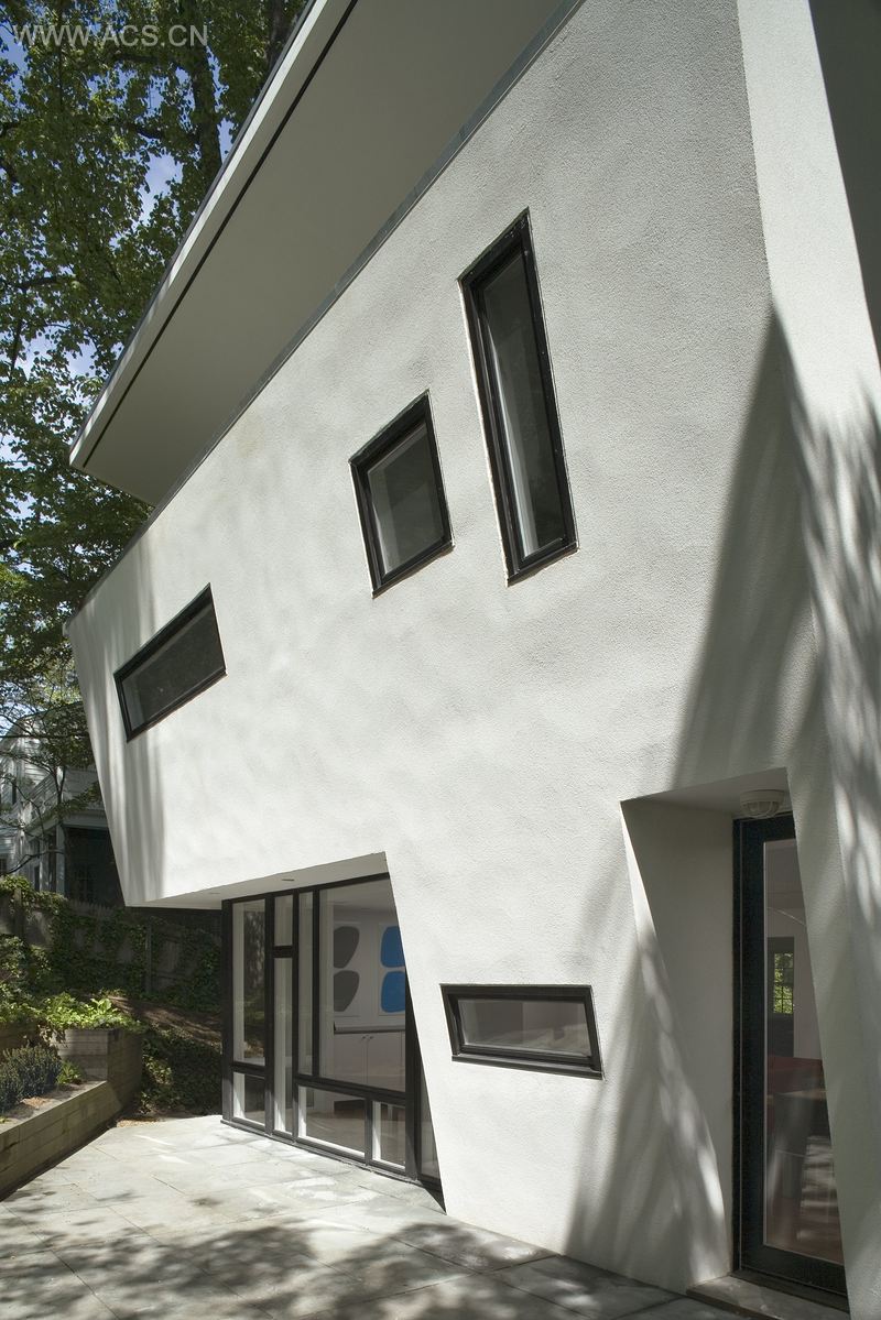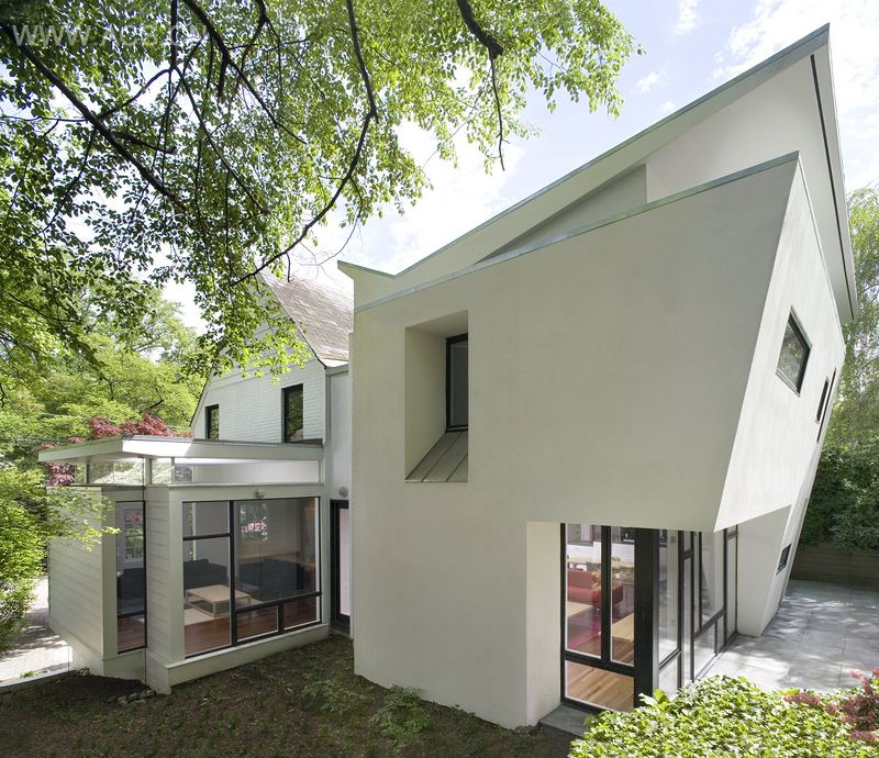 别墅最大的改变——与原有住宅同等规模的新建筑,来源于女主人“我怀孕了,是双胞胎!”这句话。新建筑采用蝶形屋顶,这一设计方案直接呼应不使新建筑压倒原有小型殖民风格住宅的想法。室内,采光井将开放性生活空间、餐厅和厨房、二楼以及上方插入的屋顶相连。