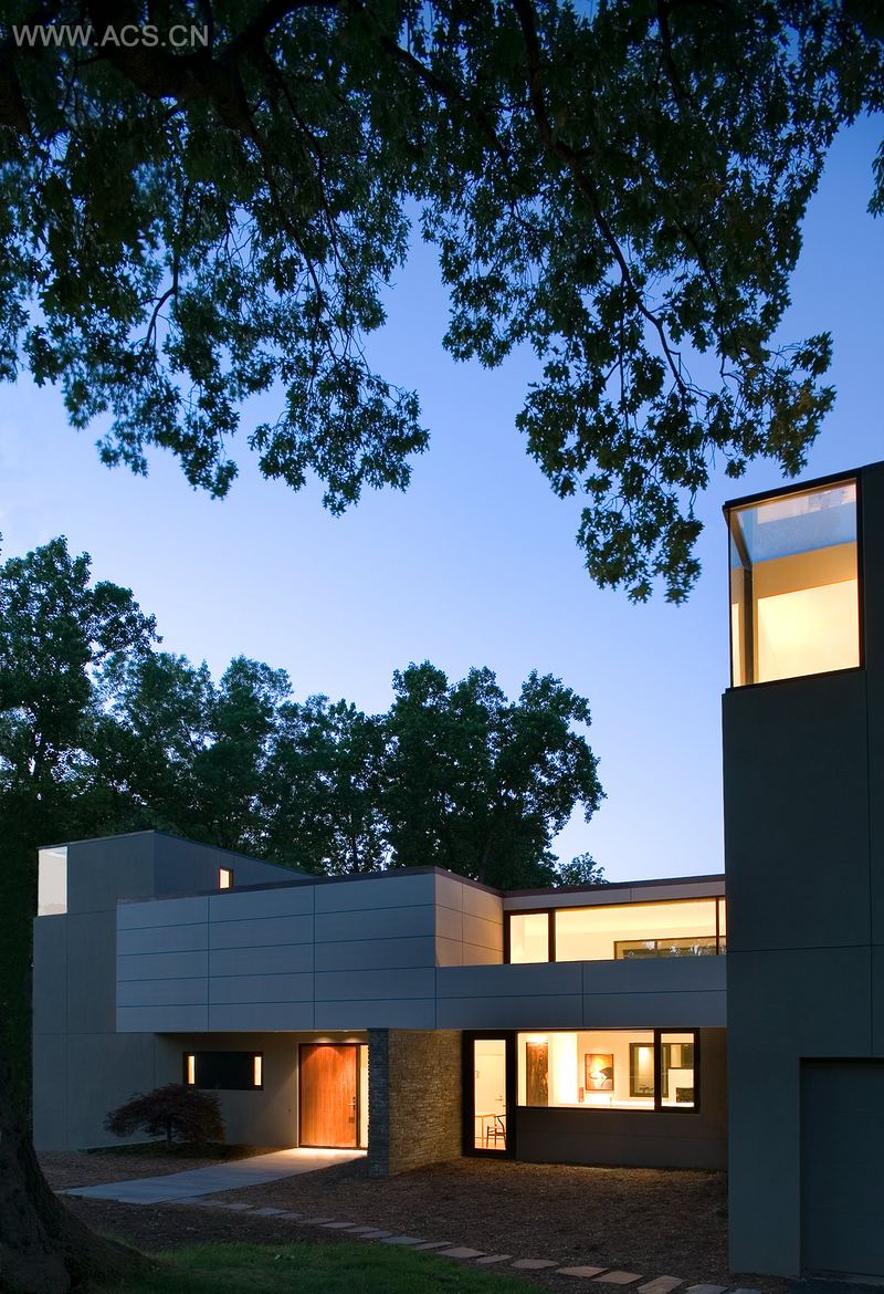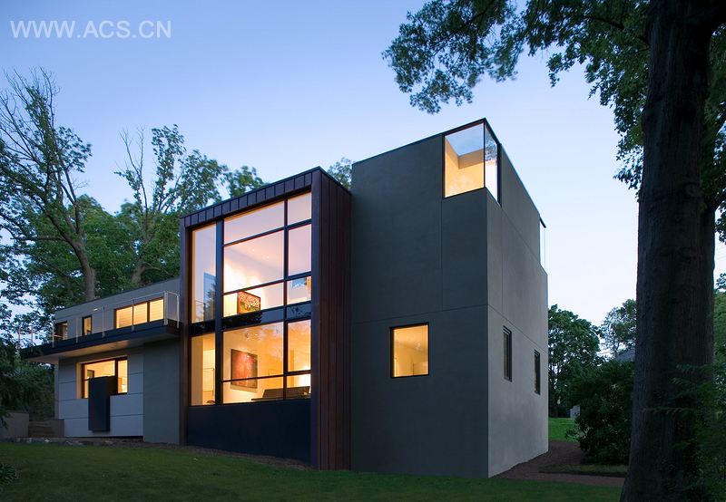 方形泥灰塔台将艺术工作室纳入其中,而主人衣帽间则悬于原屋体之上,像是从原有结构中被挤出,并形成支架架住摆动的支柱,然后覆以青铜色与乳胶粘合的面板。当融合大差异材料和建筑技术时,这种雨屏幕连接板便很好地垂直联合了新旧空间。