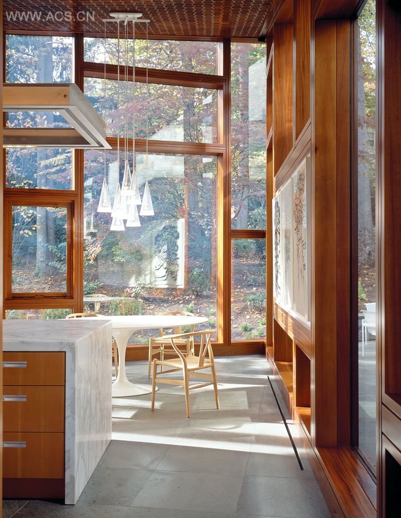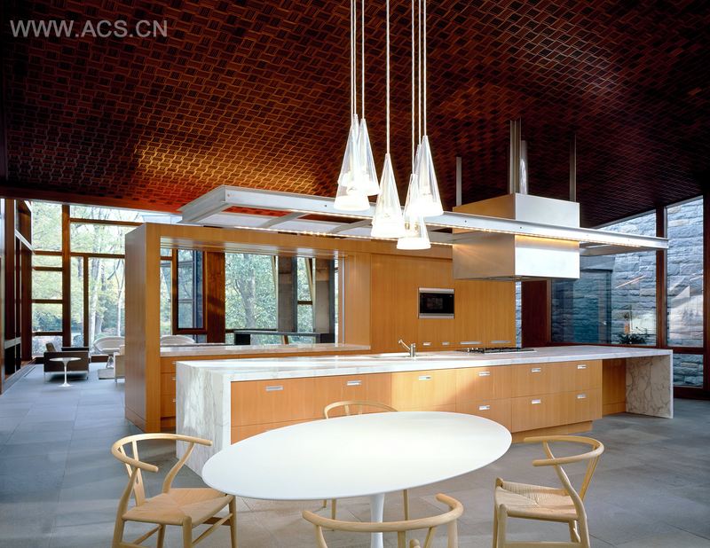 设计理念上把厚重和光线并提,将建筑构建定位在玻璃和石头上,呼应周边树木枝干并保证住户隐私。